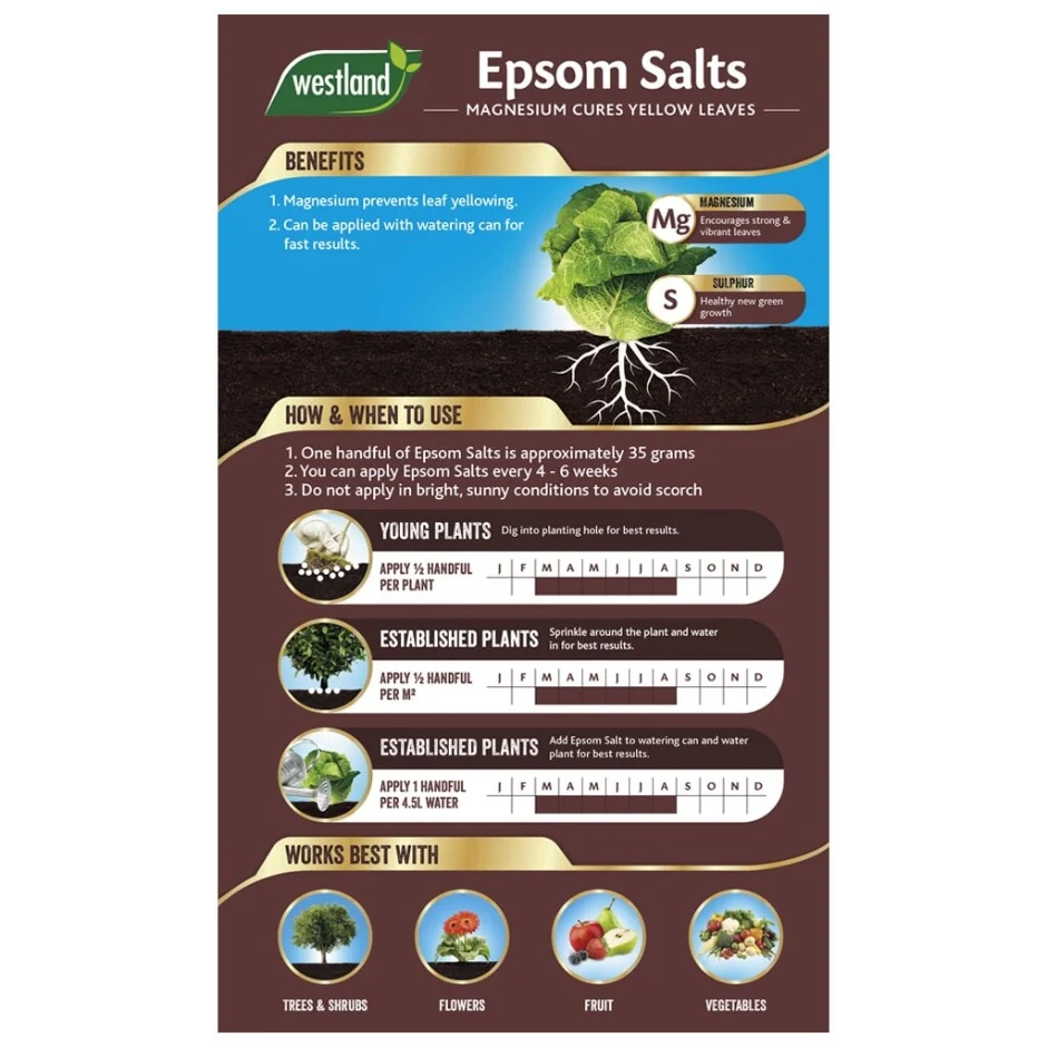 You can apply every 4-6 weeks throughout the growing season from March until the end of August to maintain leaf colour and quality. Use as a top dressing (sprinkled on the soil surface)or a base dressing (worked into the soil with a spade or hoe). During dry weather water before and after application. Epsom salt can also be dissolved in water and used as a liquid feed.